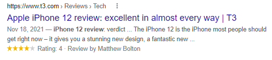 In the online world, trust is key, and trust is built primarily on ratings and reviews. Rating and review schema markup show users how many stars your customers have awarded you and how many have left a review.